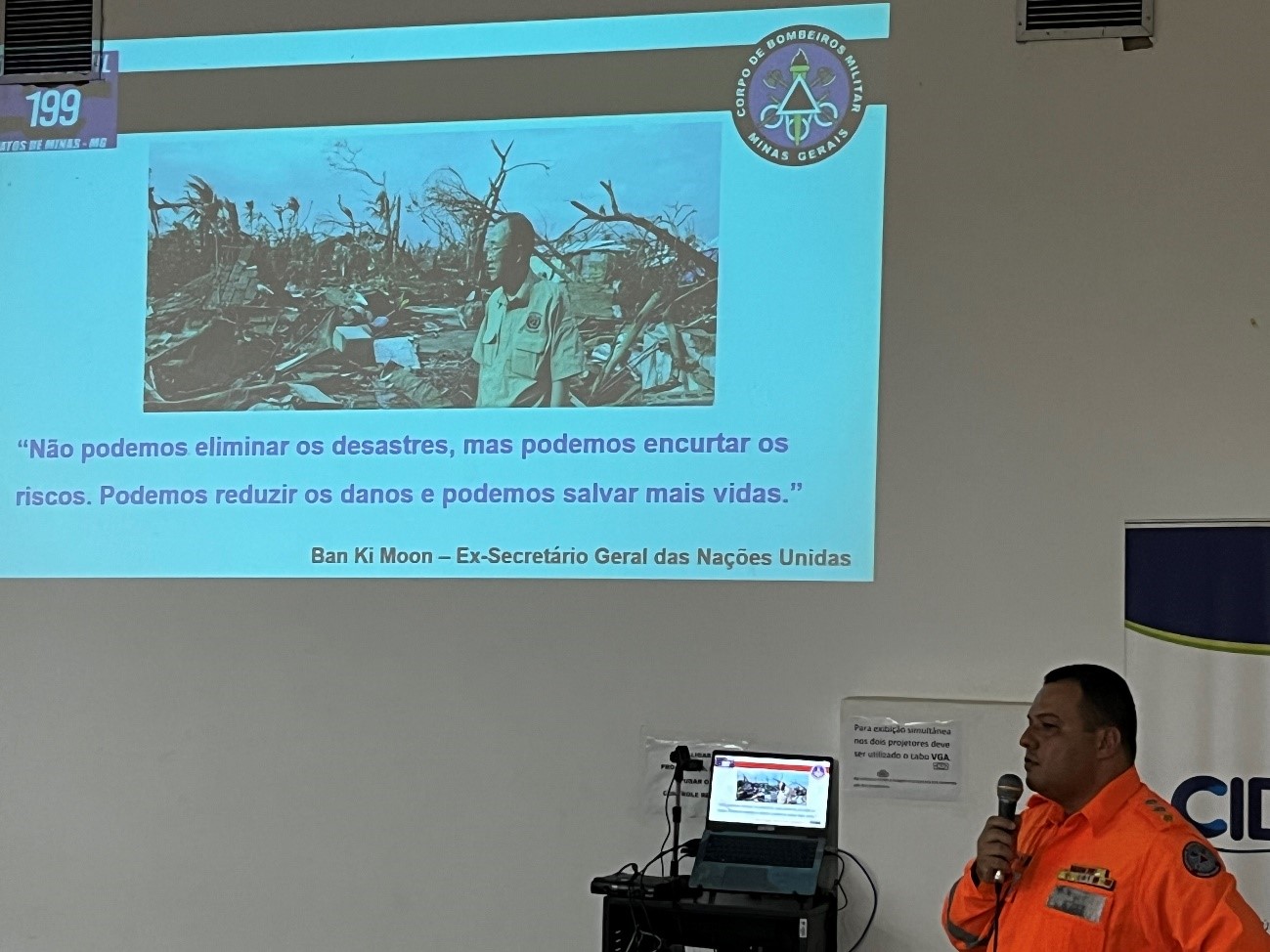 O Tenente Daniel Morais do CBMMG, professor militar na academia de bombeiros militar, que atualmente exerce a função de chefe do núcleo de prevenção do 2º COB e também de coordenador técnico operacional da CIRRD, abriu os trabalhos com a palestra “Eventos com Potencial Desastres na Região, Gestão de Riscos de Desastres e Atuação da CIRRD”.