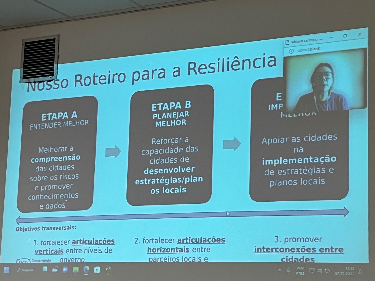 A Dra. Adriana Campelo, representante do Escritório das Nações Unidas (ONU), especialista em resiliência urbana e mudanças climáticas participou de forma virtual com o tema “Construindo Cidades Resilientes”.